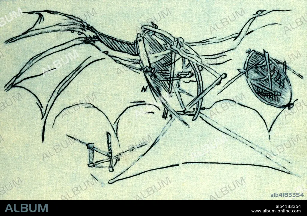Flying machine designed by Leonardo da Vinci, c1485, (1932). Italian artist and inventor Leonardo da Vinci (1452-1519) made many designs for flying machines inspired by birds. From "Die Eroberung Der Luft", (The Conquest of the Air), cigarette card album produced by the Garbáty cigarette factory, 1932. Eugene and Moritz Garbáty, who were Jewish, were driven out of business by the Nazis in the late 1930s, and forced to sell their factory which lay empty for over 70 years. [Garbaty Cigarettenfabrik, Berlin-Pankow, 1932]