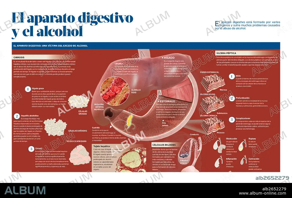 Infografía sobre los órganos que componen el aparato digestivo y los muchos problemas causados por el abuso de alcohol.