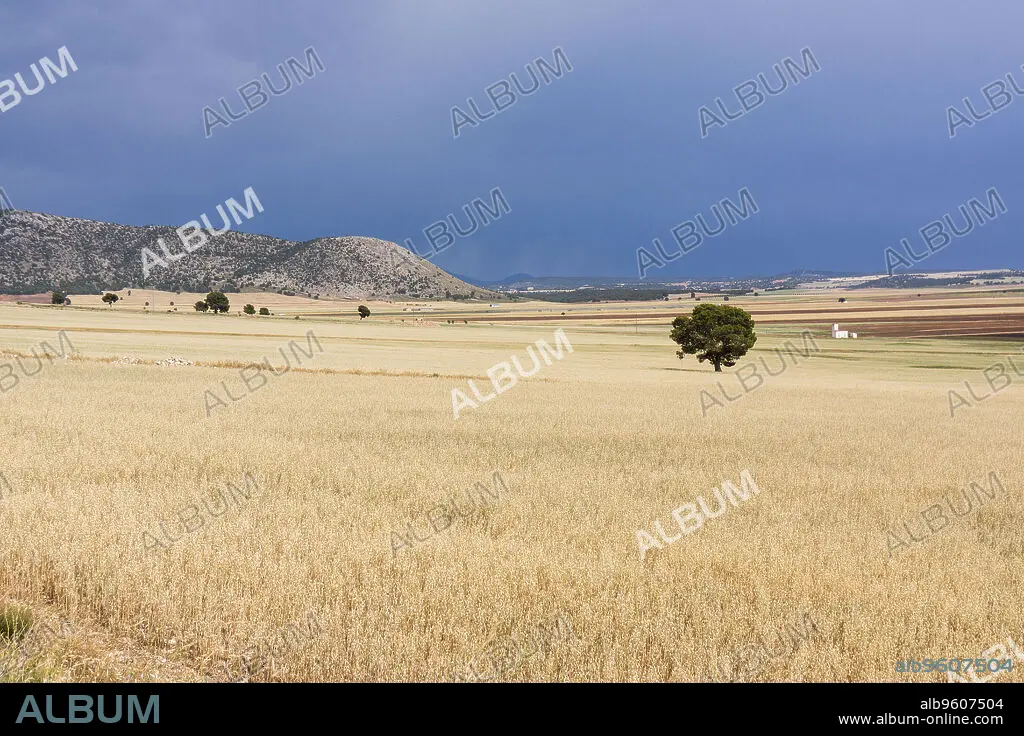 campo de cereales bajo un cielo de lluvia, Murcia, Spain.