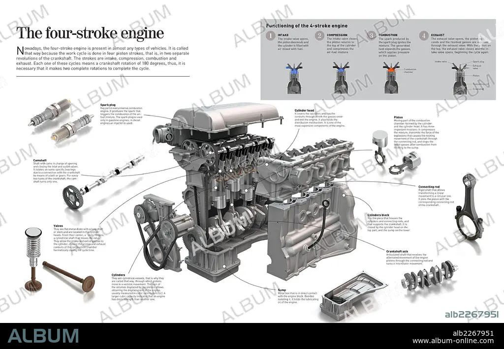 Infografía del motor de cuatro tiempos y de las partes y piezas que lo conforman.