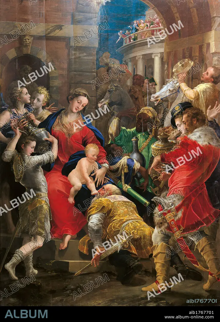 Traducción automática: Italia, Emilia Romagna, Parma, Galería Nacional. Todo. Adoración rey Reyes Magos Niño Jesús Virgen María regalos turbante moro verde rojo azul amarillo caballos arco balaustrada sable jarrón oro incienso mirra. Se requiere autorización para uso no editorial