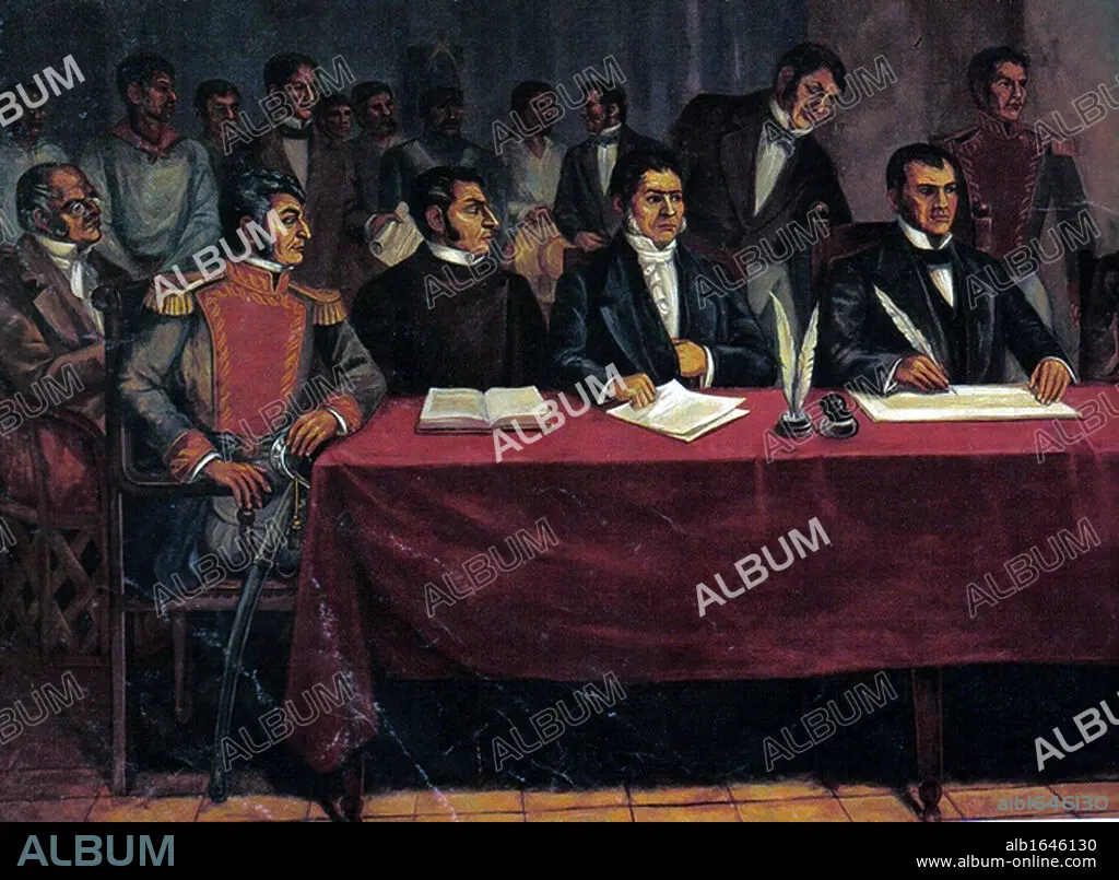 Mexican War of Independence (from Spain) 1810-1820: Congress of Chilpancingo, 1813, called by Jose Maria Teclo Morelos y Pavon (1765-1815), right, Mexican Roman Catholic Priest who became leader of the revolutionaries after the execution of Miguel Hidalgo. The Congress endorsed Mexico's declaration of independence and on 6 November signed the first legal document of separation from Spain is proclaimed.