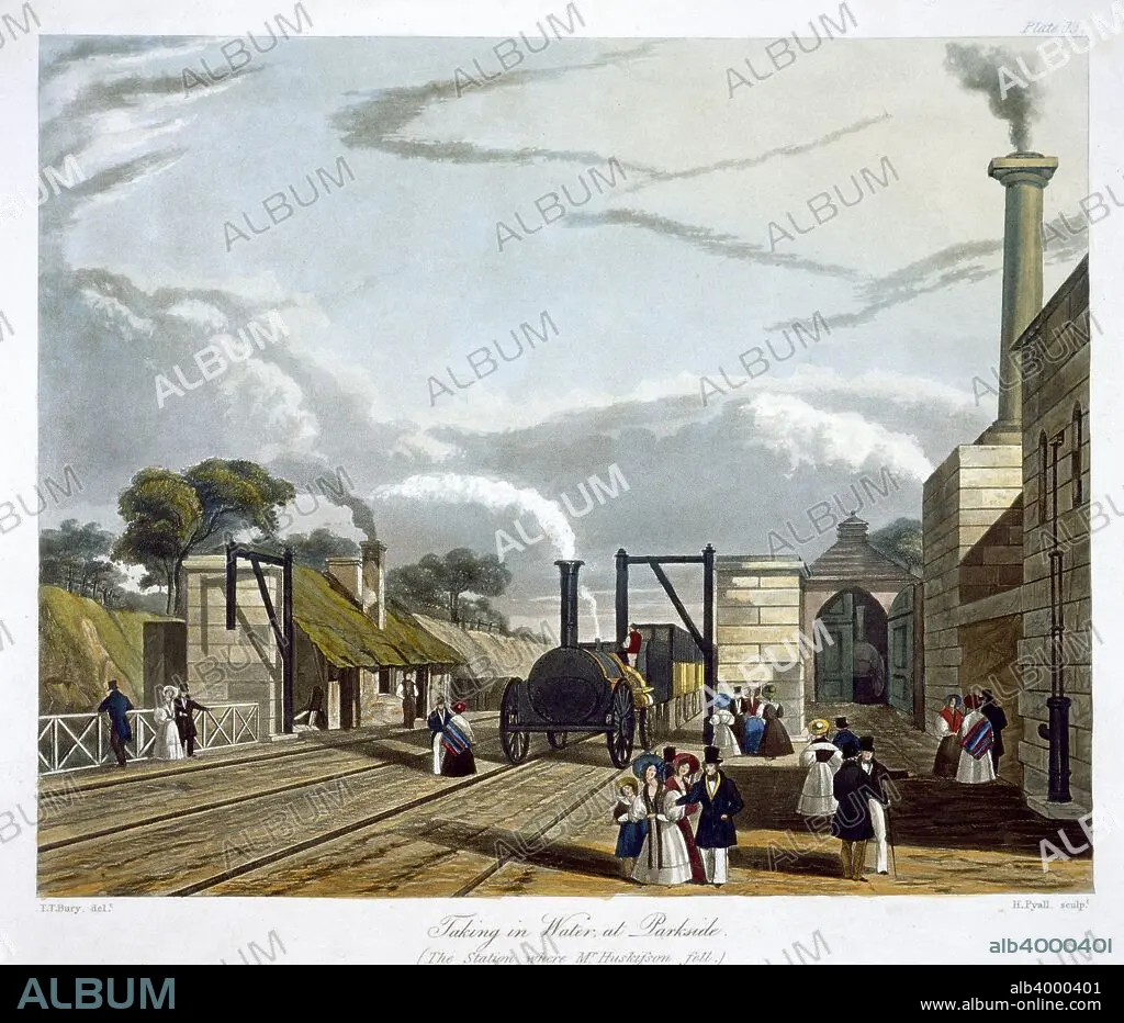 'Taking in Water at Parkside', Liverpool and Manchester Railway, 1833. The world's first intercity railway, the Liverpool & Manchester Railway opened on 15 September 1830. Parkside is famous for being the station where William Huskisson MP was injured during the opening of the Liverpool and Manchester Railway. After alighting from the 'Northumbrian', which had stopped to take in water, Huskisson was struck by another locomotive and later died from his injuries. Plate 13 from Coloured view of the Liverpool & Manchester Railway. (London, 1832-1833).