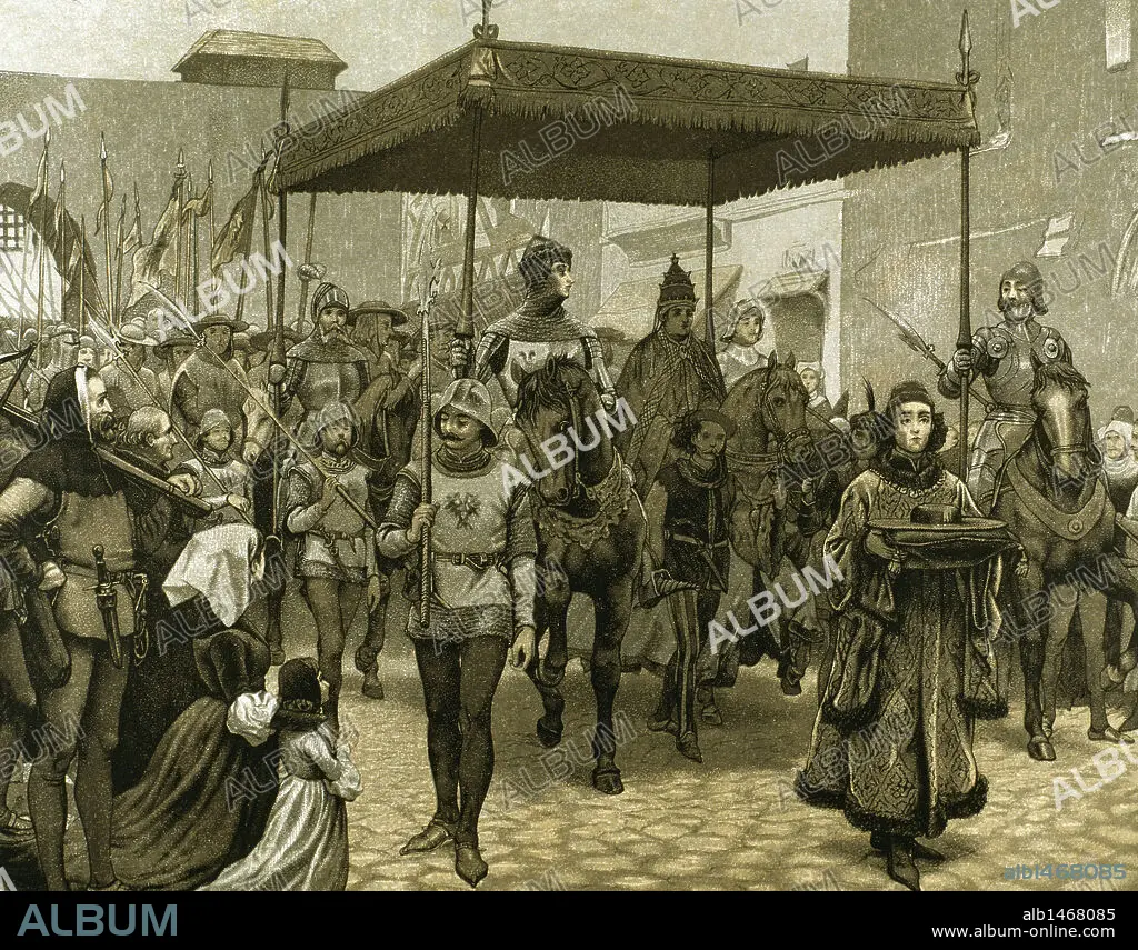 Descripción: ENTRADA DEL ANTIPAPA JUAN XXIII (1360-1554) en Constanza para celebrar el "CONCILIO DE CONSTANZA" (1414) convocado por él a propuesta del emperador Segismundo, para terminar con el gran cisma. Se declaró la superioridad de éste sobre el Pontífice y se depusieron tres Papas: Juan XXIII, Gregorio XII y Benedicto XIII, y se eligió a Martin V, como único Papa de la cristiandad. Grabado.