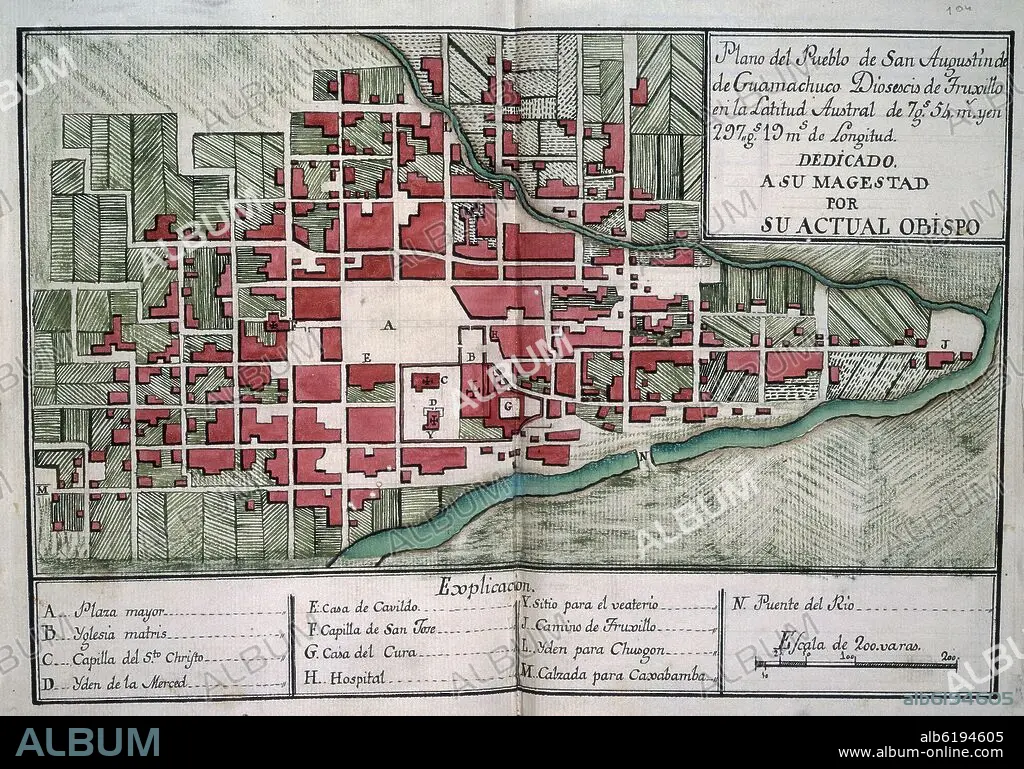 BALTASAR JAIME MARTÍNEZ COMPAÑÓN. CODICE TRUJILLO DEL PERU - TOMO I - PLANO DEL PUEBLO DE SAN AGUSTIN DE GUAMACHUCO - MANUSCRITO - SIGLO XVIII