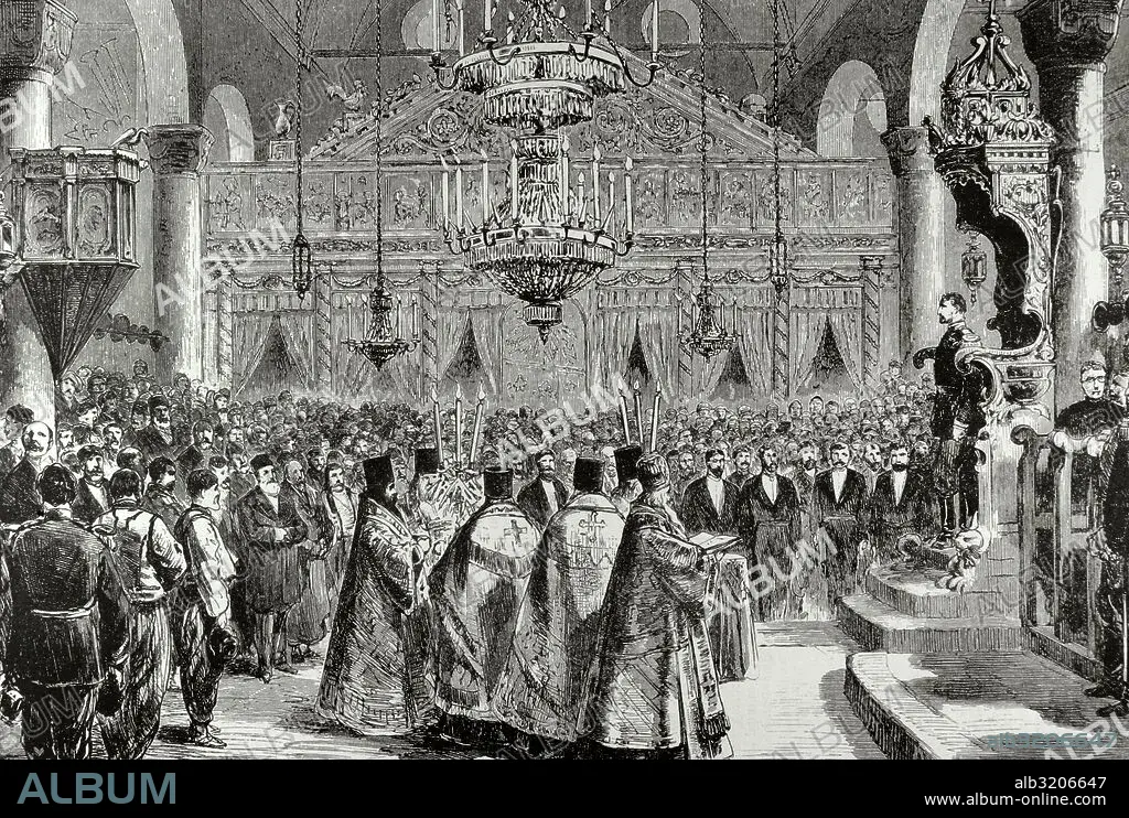 FERNANDO I de BULGARIA (1861-1948). Príncipe de Sajonia-Coburgo-Gotha. Elegido príncipe de Bulgaria en 1887. Aprovechó la crisis balcánica para proclamarse independiente del sultán y tomó el título de zar de los búlgaros (1908-1918). "Celebración del Te-Deum en la catedral de Tirnova·. Grabado de la Ilustración, 1887.