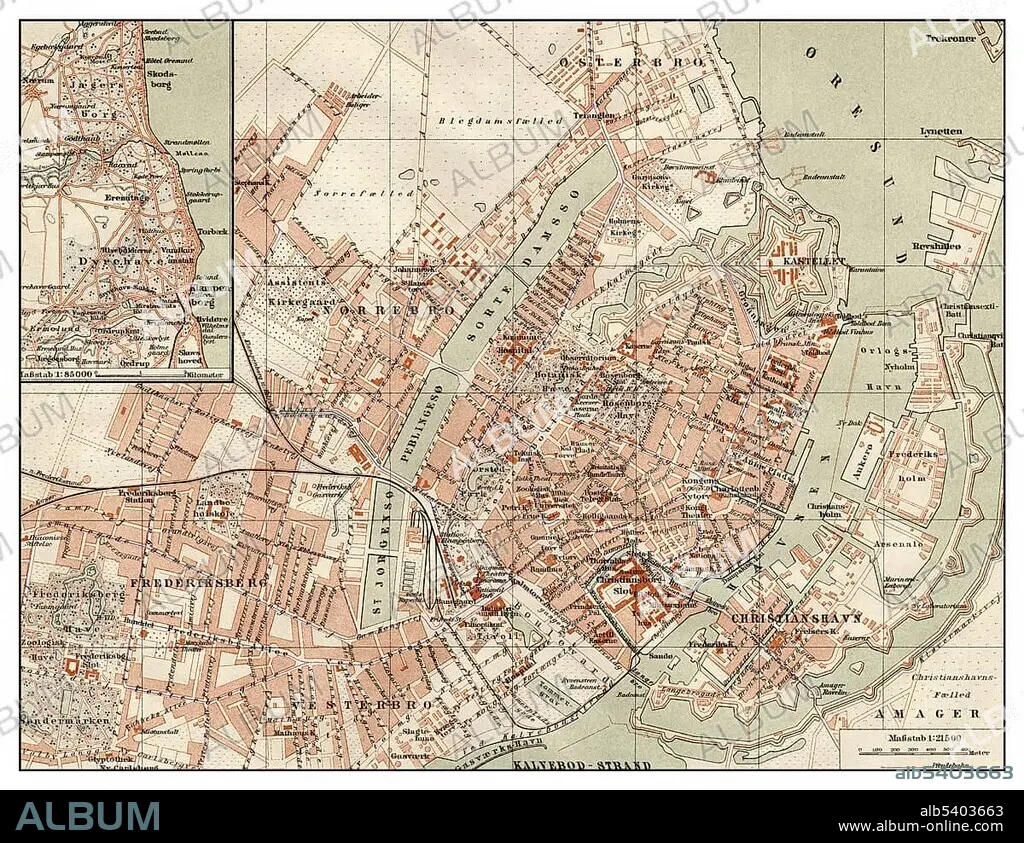 Historic map of Copenhagen, Denmark, 19th Century, from Meyers Konversations-Lexikon encyclopaedia, 1889, Europe.