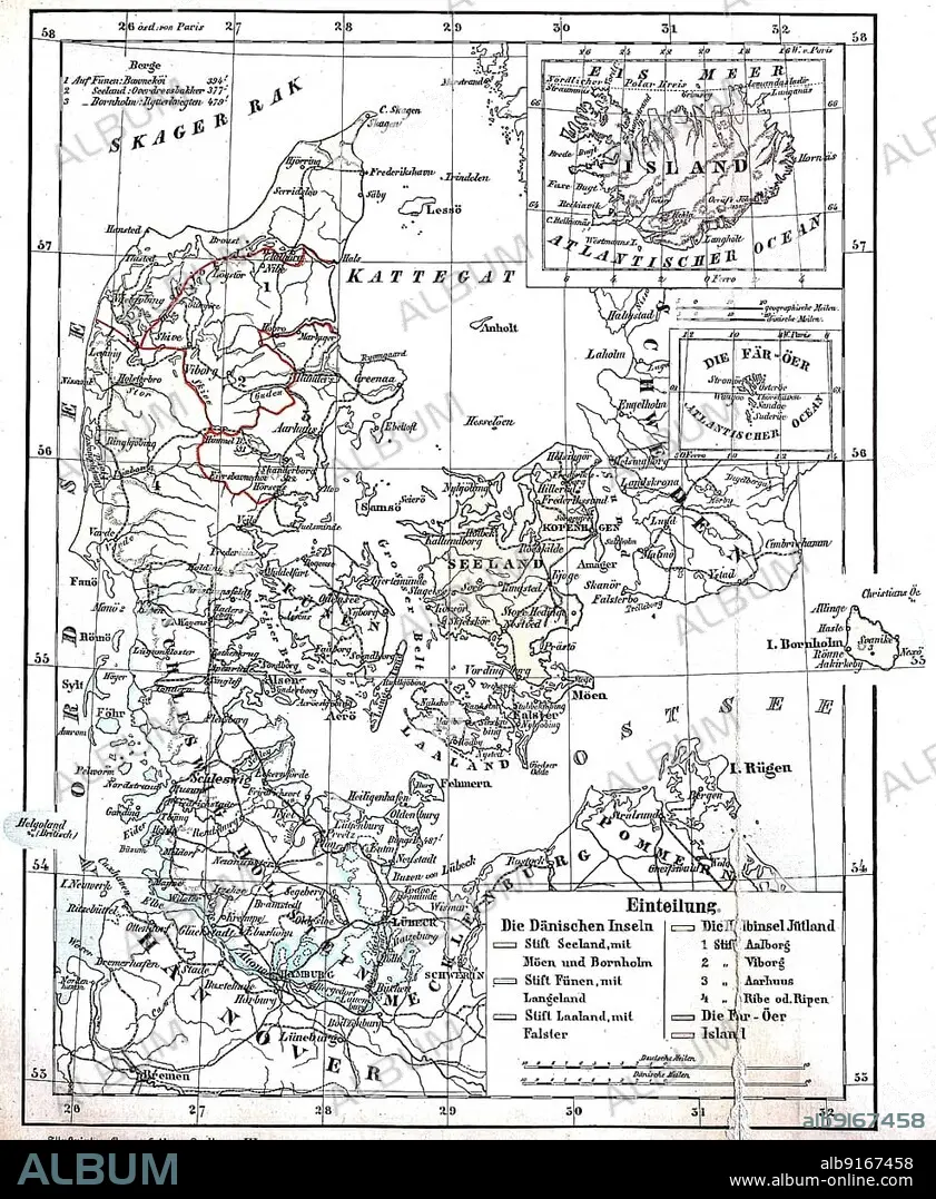 Map of Denmark and Prussian Province of Schleswig-Holstein circa 1890, Germany, Historical, digitally restored reproduction of a 19th century original, exact original date unknown, Europe.