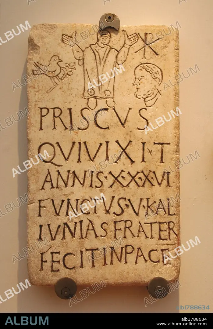 ARTE PALEOCRISTIANO. ITALIA. Primeros cristianos. Lápida sepulcral de Prisco. Inscripción con fórmula cristiana "in pace". Retrato del difunto con barba, símbolo de la paloma con la rama de olivo (alma del muerto), y monograma de Constantino. 2º mitad del siglo IV d. C. Museo de las Termas de Diocleciano. Roma.