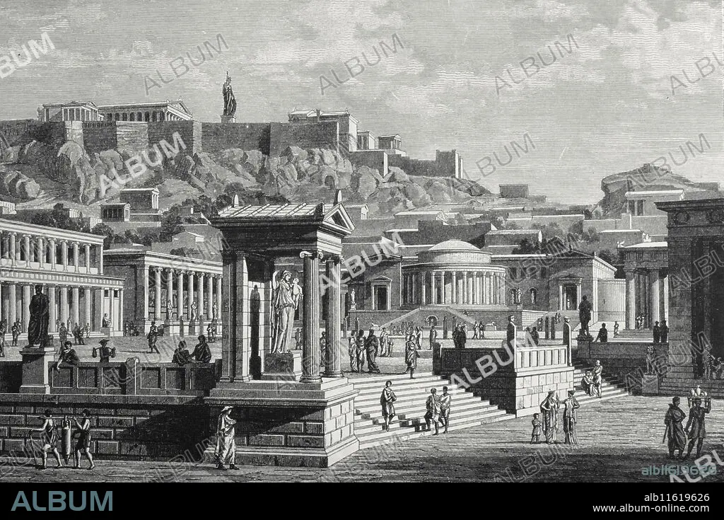 Athens. Engraving of the agora or marketplace. The Acropolis is in the background. Engraving by J. Buhlmann. "Ancient Greece 8 engravings", 1881. Later colouration. 19th century