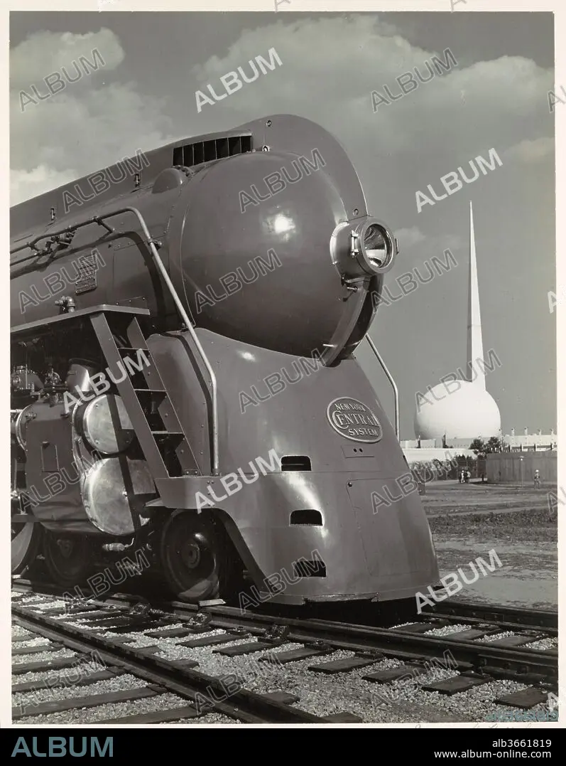 [Locomotive, with Entrance to Perisphere of 1939 New York World's Fair in Background]. Artist: Samuel H. Gottscho (American, 1875-1971). Dimensions: 33.0 x 25.4 cm (13 x 10 in.). Date: ca. 1939.