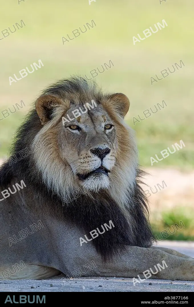 Lion (Panthera leo), black-maned Kalahari male, resting, rainy season with green surroundings, portrait, Kalahari Desert, Kgalagadi Transfrontier Park, South Africa, Africa.