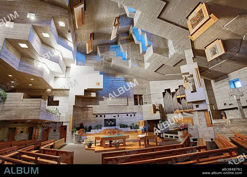 Interior of the Church of St. Nicolas, made of concrete, architect Walter Maria Förderer, Hérémence, Valais, Switzerland, Europe.