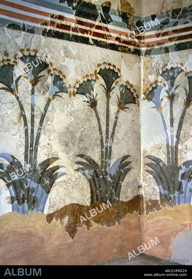 Arte minoico. Fresco de los lirios de agua o papiros. Habitación de las Ladies. Yacimiento de Acrotiri. Estuco pintado. Fechado hacia el 1550 a. C. Obra procedente de la Isla de Thera (Santorini). Museo Arqueológico Nacional. Atenas. Grecia.