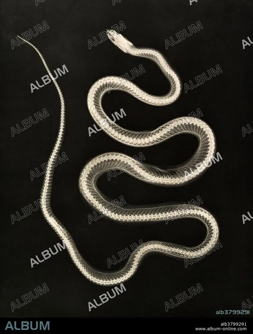 Historical X-ray of an Aesculapian snake, 1896. The Aesculapian snake (now Zamenis longissimus, previously Elaphe longissima), is a species of nonvenomous snake native to Europe. Growing up to 2 metres (6.6 ft) in total length, it has been of cultural and historical significance for its role in ancient Greek and Roman mythology and derived symbolism. Taken by Josef Maria Eder (Austrian, 1855-1944) and Eduard Valenta (Austrian, 1857-1937). Photogravure. Eder was the director of an institute for graphic processes and the author of an early history of photography. With the photochemist Valenta, he produced a portfolio in January 1896, less than a month after Wilhelm Conrad Rontgen published his discovery of X-rays. Eder and Valenta's volume, from which this plate derives, demonstrated the X-ray's magical ability to reveal the hidden structure of living things.