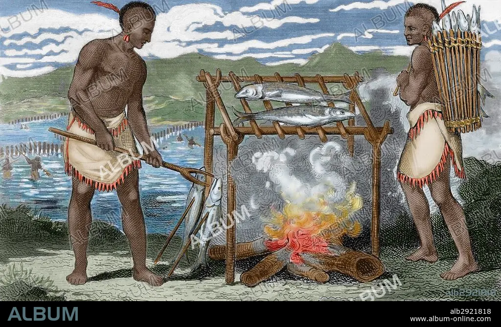 AMERICA DEL NORTE. SIGLOS XV AL XVII. "LOS PONCA". Tribu de indios norteamericanos ubicados inicialmente en la costa atlántica. Se asentaron en Virginia y las Carolinas en los siglos XV y XVI, y debido a la presión ejercida por los colonos blancos se trasladaron a lo que hoy es Missouri y después Minnesota. "VIRGINIO ASANDO PESCADO". Grabado francés del año 1844. Coloreado.
