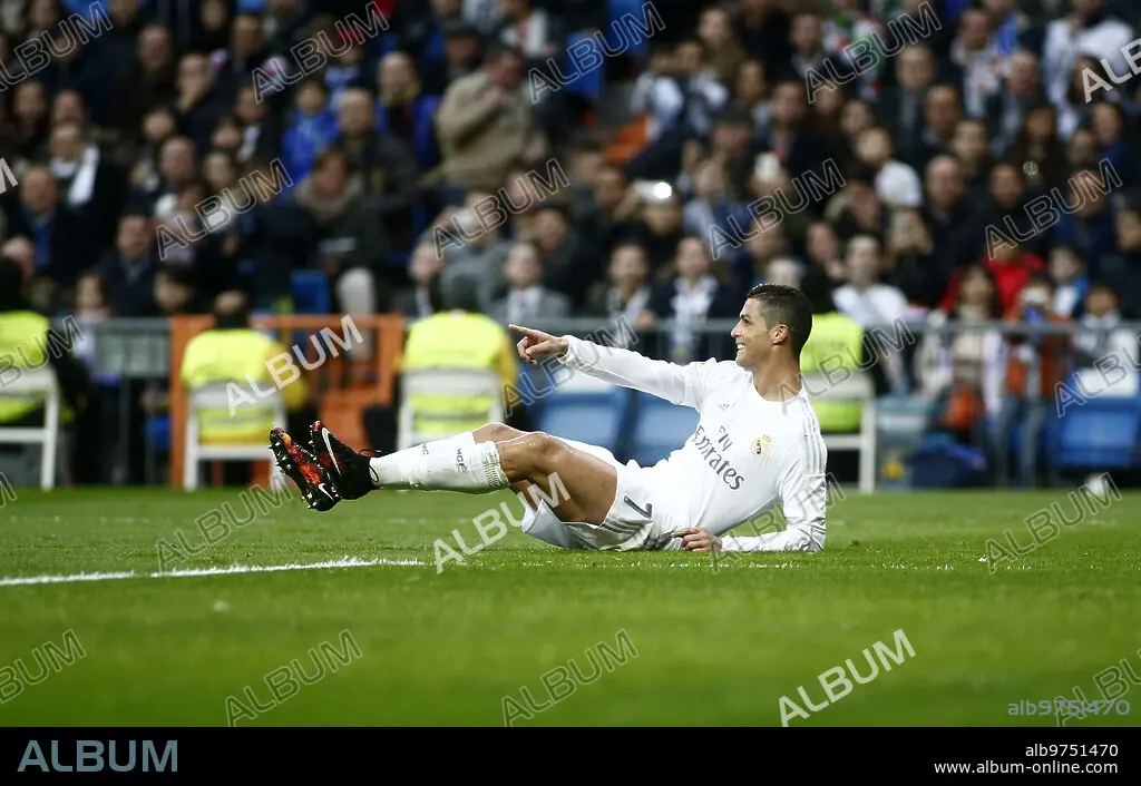 Descripción: Madrid, 30/12/2015. Partido de liga disputado en el estadio Santiago Bernabéu entre el Real Madrid y la Real Sociedad. En la imagen, Cristiano Ronaldo celebra un gol. Foto: Oscar del Pozo ARCHDC