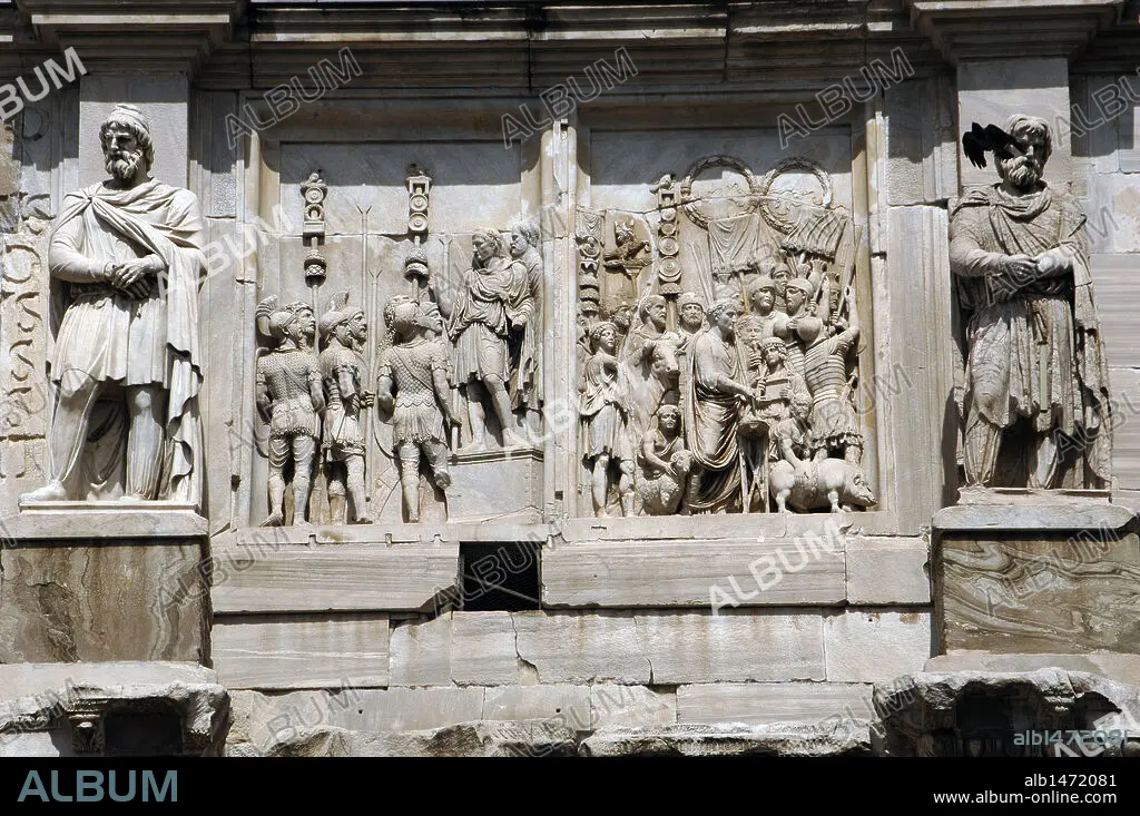 ARTE ROMANO. ITALIA. ARCO DE CONSTANTINO. Arco triunfal erigido en el siglo IV por el Senado en honor del emperador Constantino, tras su victoria sobre Majencio en el Puente Milvio (313). Detalle de un RELIEVE. ROMA.
