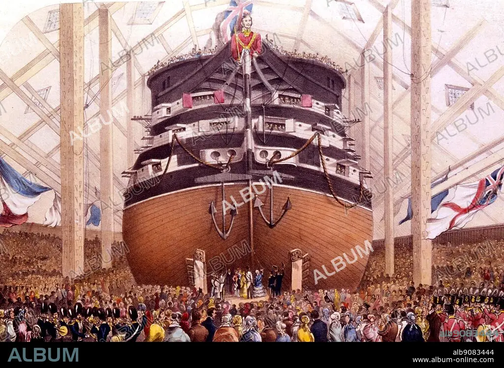 Engraving of the HMS Royal Albert 1854. The first-rate HMS 'Royal Albert' was launched at Woolwich Dockyard on 13 May 1854. Queen Victoria presided over her launching ceremony. 'Royal Albert' was immediately sent to the Crimea, where she saw active service in the Black Sea. This event occurred at a high point in the history of Woolwich dockyard which was to close in 1869. 'Royal Albert', a 121-gun three-decker steam line-of battle ship, was immediately sent to the Crimea where she saw active service in the Black Sea. Named after the queens husband, the 'Royal Albert' flies the royal standard. Loyal supporters endorse both their monarch and the building of another warship for the nation, during the Crimean War.