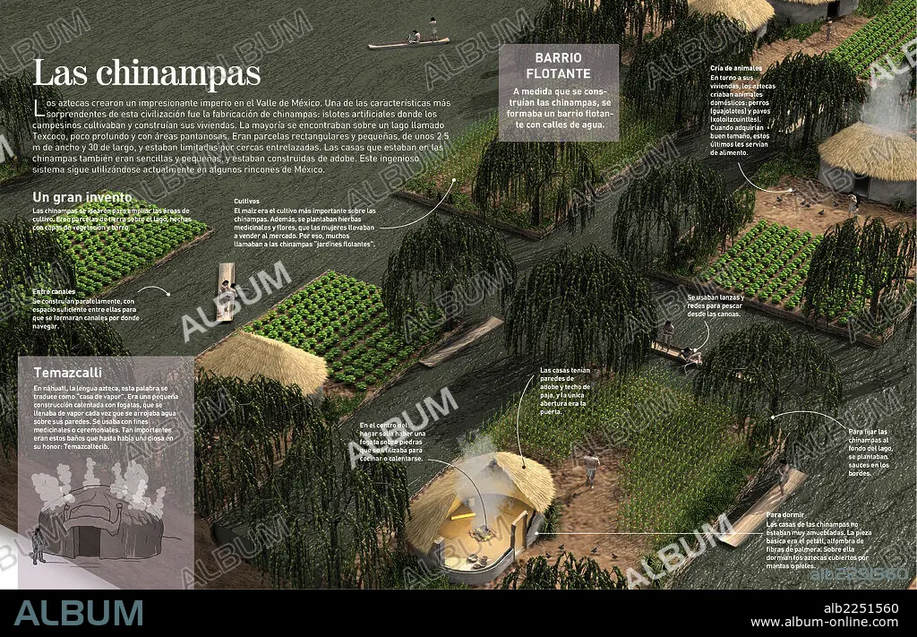 Infografía de las chinampas, un método mesoamericano (primero de los toltecas y después de los aztecas) antiguo de agricultura y expansión territorial.