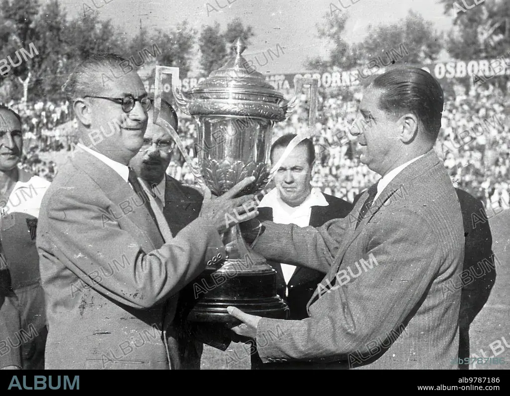 Descripción: 16 septiembre 1952. Entrega al Sevilla de la copa Marques de Foronda. El presidente de la real federación Española de Futbol, Sr. sancho Dávila, Hace entrega de dicho trofeo al presidente del Sevilla, Sr. Pizjuan, poco antes de comenzar el partido jugado el domingo en el Nervión.