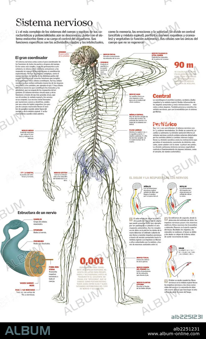 Infografía del sistema nervioso humano, la estructura de los nervios, su funcionamiento y los actos reflejos.