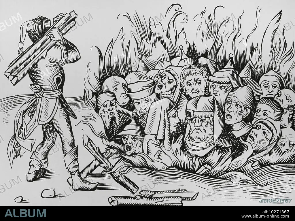 Los judíos de Colonia quemados vivos en la noche del 23 al 24 de agosto de 1349. Facsímil de un grabado en "Liber Chronicarum Mundi". Nuremberg, 1493. "Moeurs, usages et costumes au moyen-âge et à l'époque de la Renaissance", por Paul Lacroix. París, 1878.