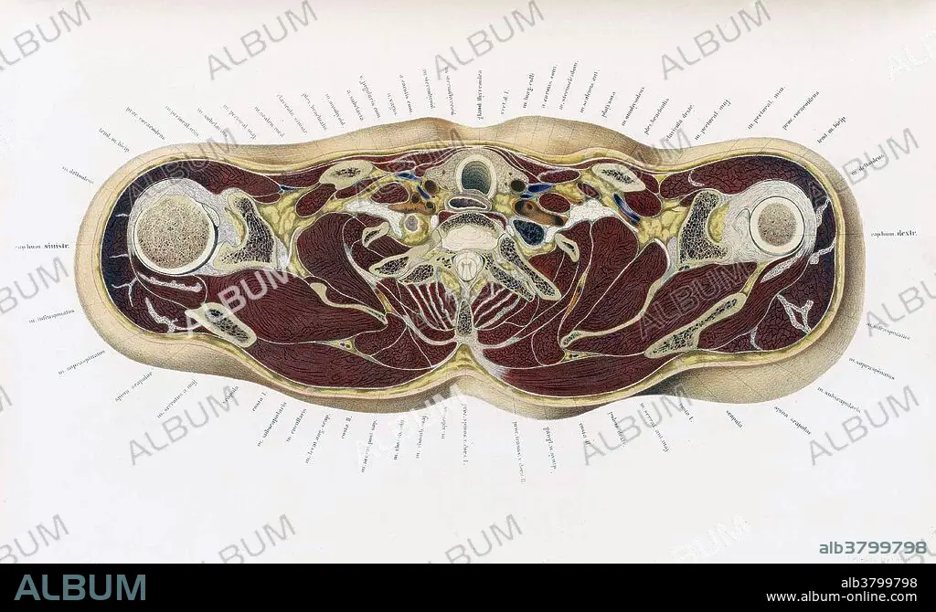 Table 8. Anatomical atlas "Topographisch-anatomischer Atlas nach Durchschnitten an gefrornen Cadavern" by Christian Wilhelm Braune, with illustrations by C. Schmiedel, published in 1872. Later translated into English as "An atlas of topographical anatomy: after plane sections of frozen bodies". Christian Wilhelm Braune (July 17, 1831 - April 29, 1892) was a German anatomist. He is known for his excellent lithographs of cross-sections of the human body, and his pioneer work in biomechanics. He also pioneered the use of frozen cadavers for anatomical investigations. Braune was inspired by the photographic work of French scientist Étienne-Jules Marey involving anatomical movement. With Otto Fischer, he conducted research involving the position of the center of gravity in the human body and its various segments. By first determining the planes of the "gravitational centers" of the longitudinal, sagittal and frontal axes of a frozen human cadaver in a given position, and then dissecting the cadaver with a saw, they were able to establish the center of gravity of the body and its component parts. Braune and Fischer also did extensive work on the fundamentals of resistive forces that the body's muscles need to overcome during movement.
