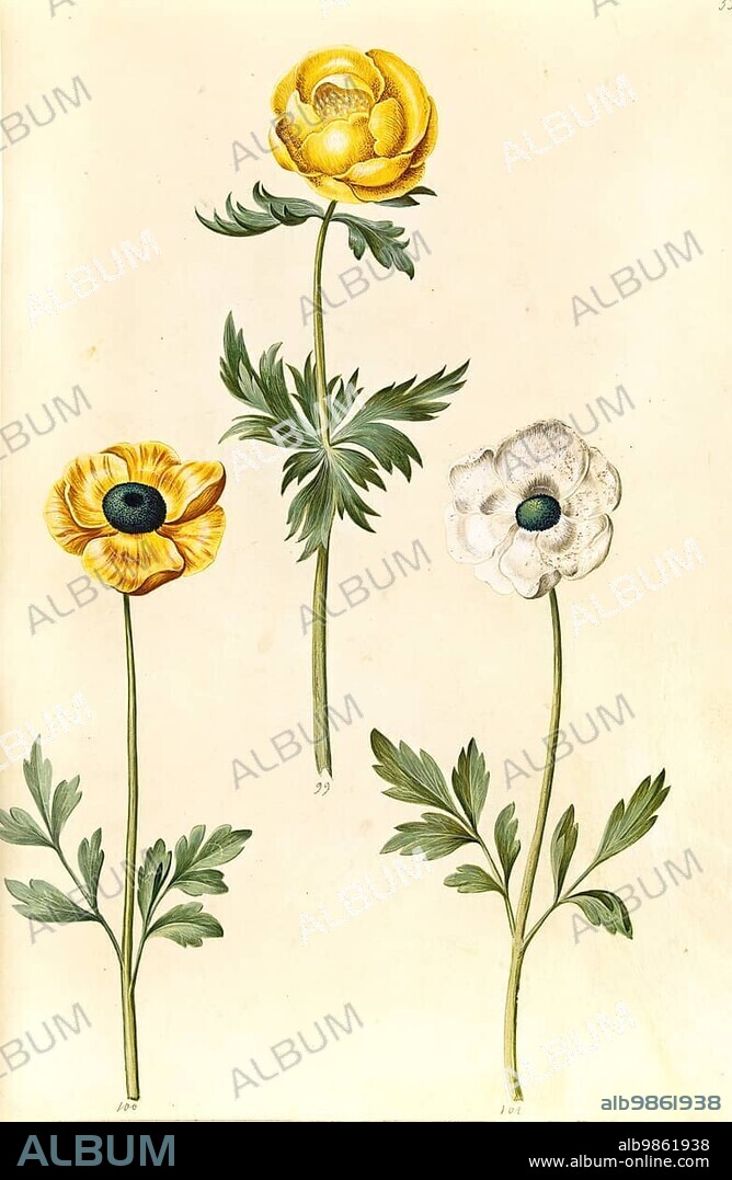 Globeflower (Trollius europaeus), European meadow plum, Asian buttercup (Ranunculus asiaticus), garden buttercup, Historic, digitally restored reproduction from a 19th century original
