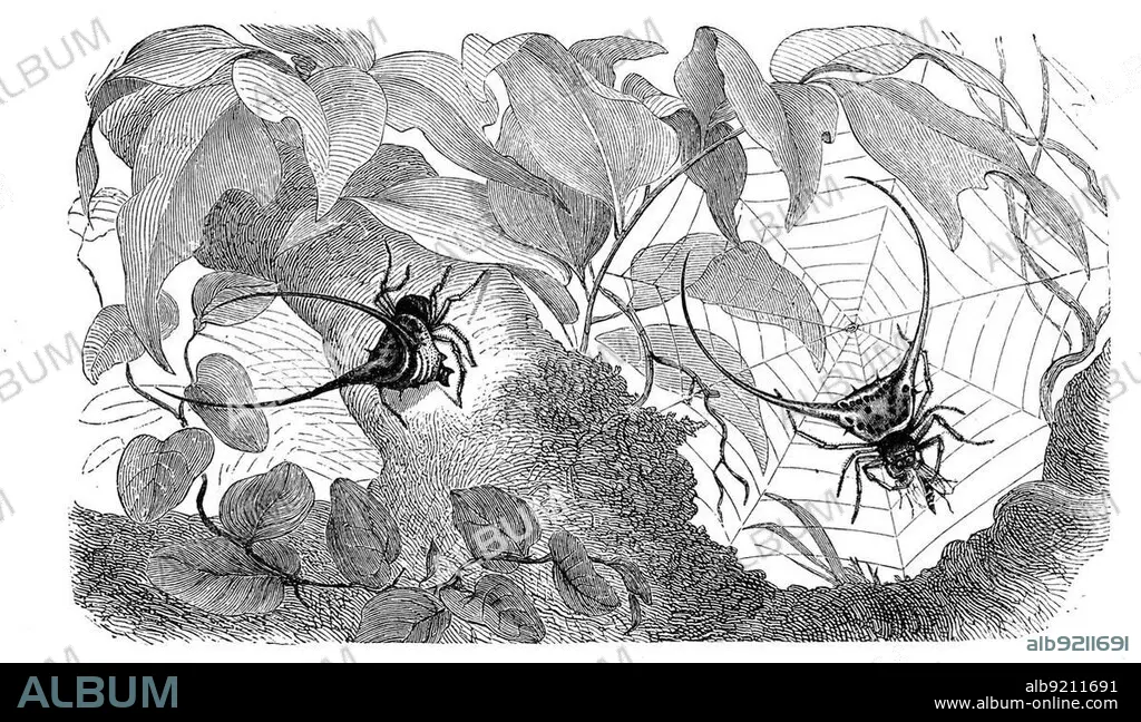 Insects, pincer spider, Macracantha arcuata, Gasteracantha arcuata, web spider from the family of the true wheel web spiders, Historical, digitally restored reproduction from a 19th century original.
