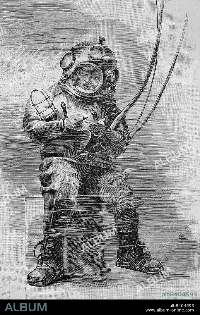 Diver in full equipment under water, 1885, England, Historic, digitally restored reproduction of an original 19th century painting, exact original date unknown.