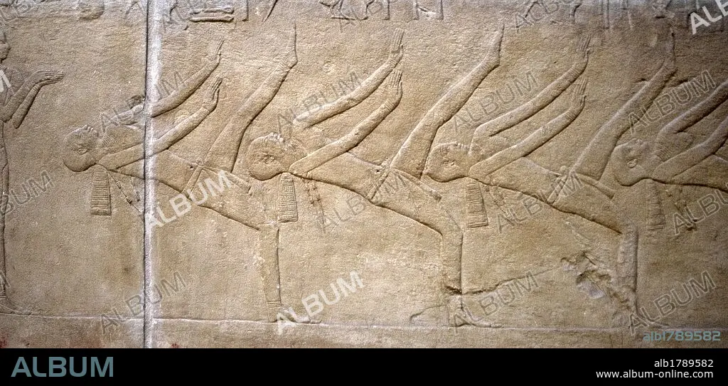 Descripción: ARTE EGIPCIO. EGIPTO. MASTABA DE KAGEMNI o MENI. Tumba de un alto funcionario de la VI DINASTIA. IMPERIO ANTIGUO. Su interior se encuentra decorado con relieves menfitas. Detalle relieve con escena de danza. NECROPOLIS SAKKARA.