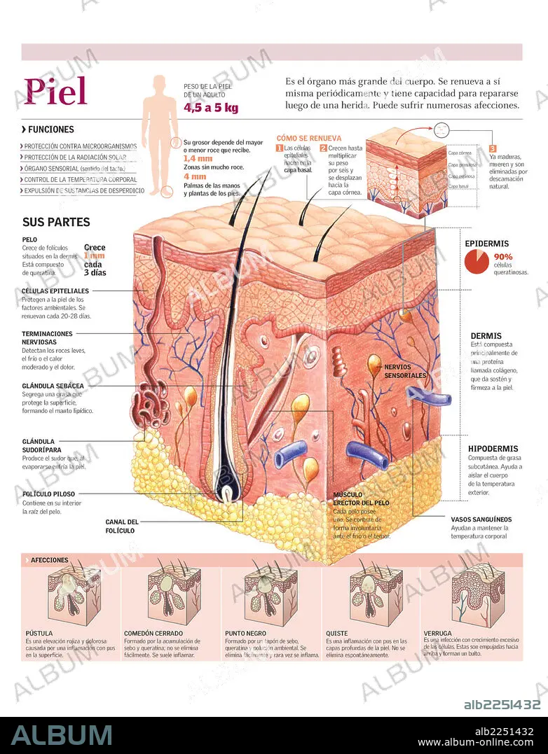 Infografía de las capas y partes de la piel, sus funciones, renovación y afecciones.