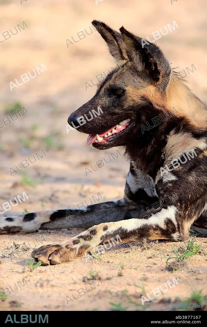 African wild dog (Lycaon pictus), adult, alert, resting, animal portrait, Sabi Sand Game Reserve, Kruger National Park, South Africa, Africa.