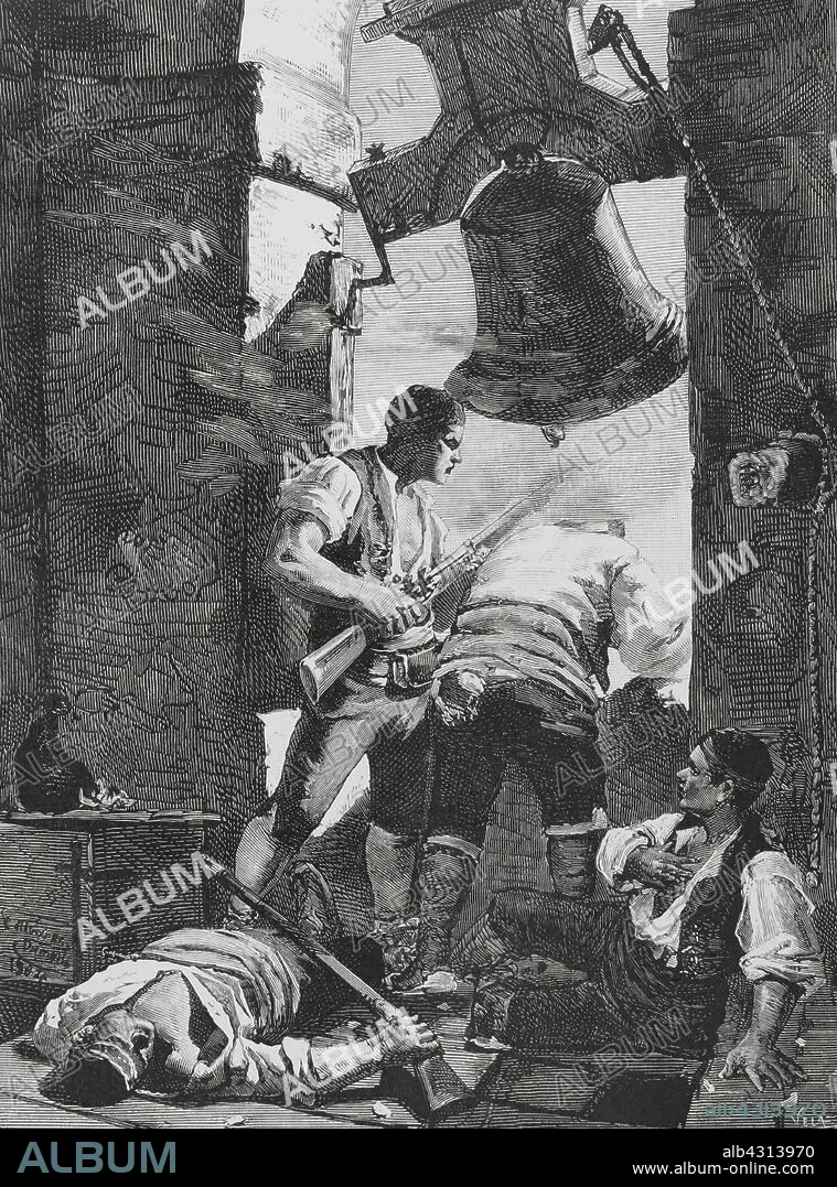 Heroica defensa de la torre de San Agustín en Zaragoza en la Guerra de la Independencia. Episodio que tuvo lugar el 1 de febrero de 1809, durante el segundo sitio de Zaragoza, en la Guerra de la Independencia Española (1808-1814). La torre de San Agustín pertenecía al edificio del convento de los Agustinos, siendo destruida en el asedio. Grabado por Vela a partir del cuadro de César Alvarez Dumont (1866-1945), 1884. La Ilustración Española y Americana, 1884.
