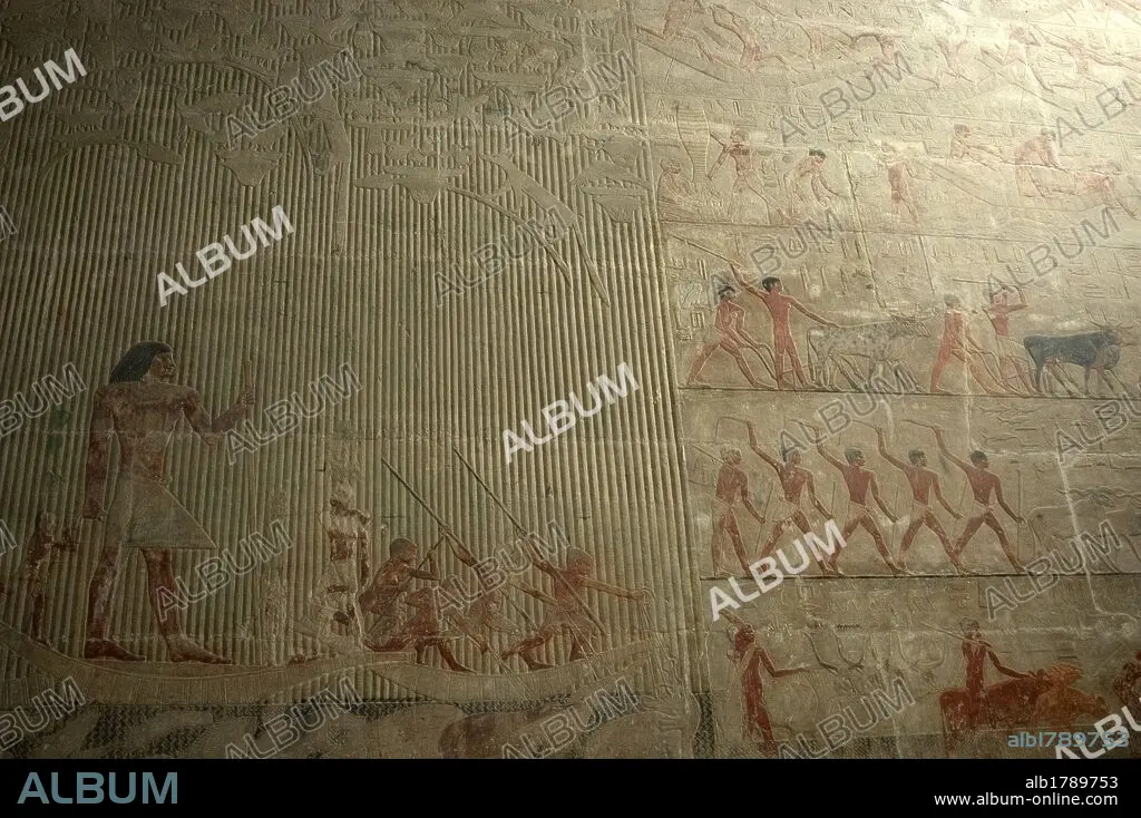 ARTE EGIPCIO. EGIPTO. Relieves policromados del interior de la MASTABA DE TI. Importante personaje de la corte de finales V DINASTIA. IMPERIO ANTIGUO. Escenas de PESCA, RAMADERIA Y AGRICULTURA. NECROPOLIS DE SAKKARA.