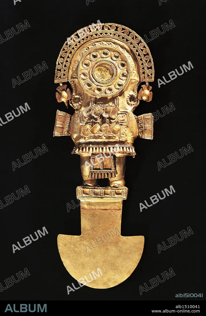 Pre-Inca civilization, Peru, 11th-16th century. Chimu culture. Embossed gold ceremonial knife. From Lambayeque treasure.