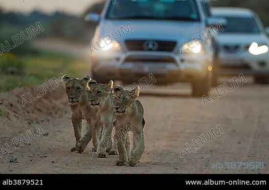 Lions (Panthera leo), three cubs walking on a road, at dawn, cars behind for morning game drive, Kalahari Desert, Kgalagadi Transfrontier Park, South Africa, Africa.