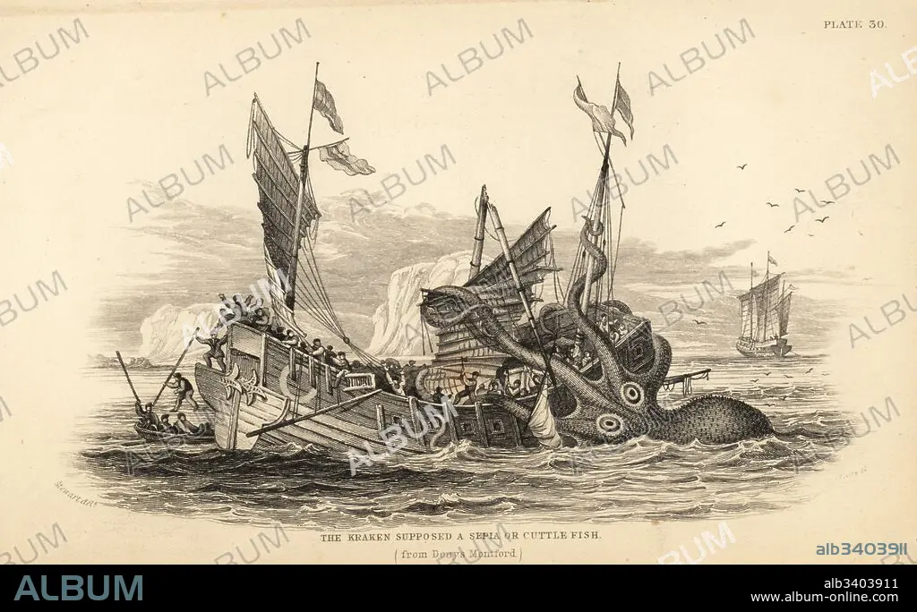 Kraken or giant cuttlefish attacking a fishing boat off the coast of Angola. After a description by Pierre Denys de Montfort in his Natural History of the Mollusca. Probably a giant squid, Architeuthis species. Steel engraving by W.H. Lizars after an illustration by James Stewart from Robert Hamilton's Amphibious Carnivora, part of Sir William Jardine's Naturalist's Library: Mammalia, Edinburgh, 1839.