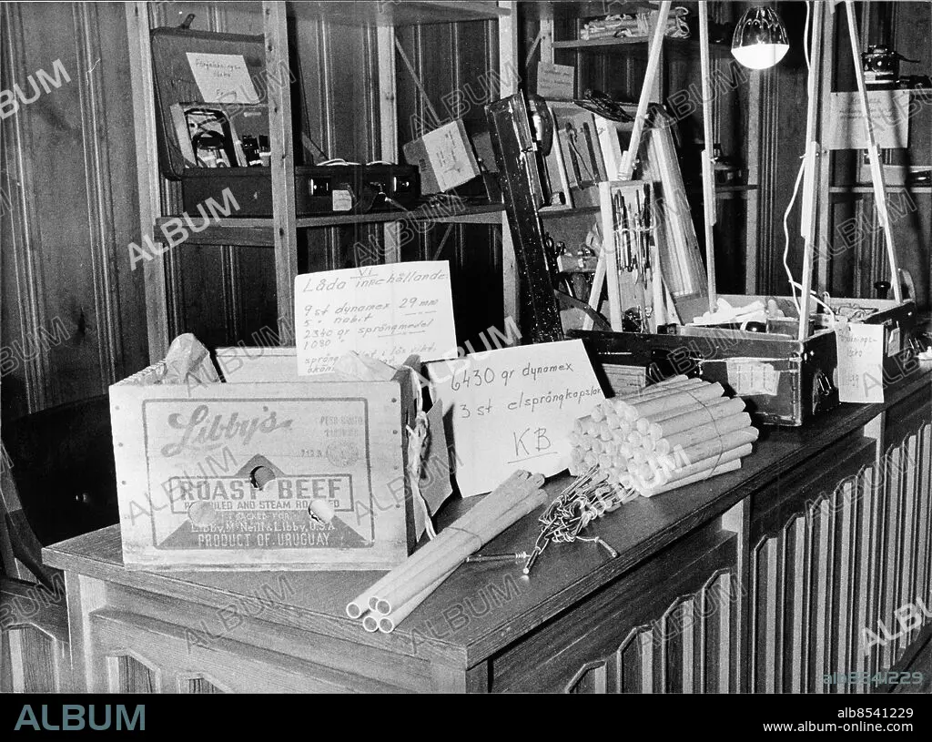 Stockholm 1977-08-11. Operation Leo, namn på en planerad kidnappning av statsrådet Anna-Greta Leijon som leddes av den tyske terroristen Norbert Kröcher. Operationen ansågs vara en hämndaktion då Leijon ansvarat för utvisningen av de fem överlevande terroristerna från Västtyska ambassaddramat i Stockholm två år tidigare. Säkerhetspolisen avslöjade planerna och såväl tyska som svenska medborgare dömdes för brotten. BILDEN: Terroristligans beslagtagna utrustning hos polisen. Foto: Dan Hansson / SvD / TT / kod 12014