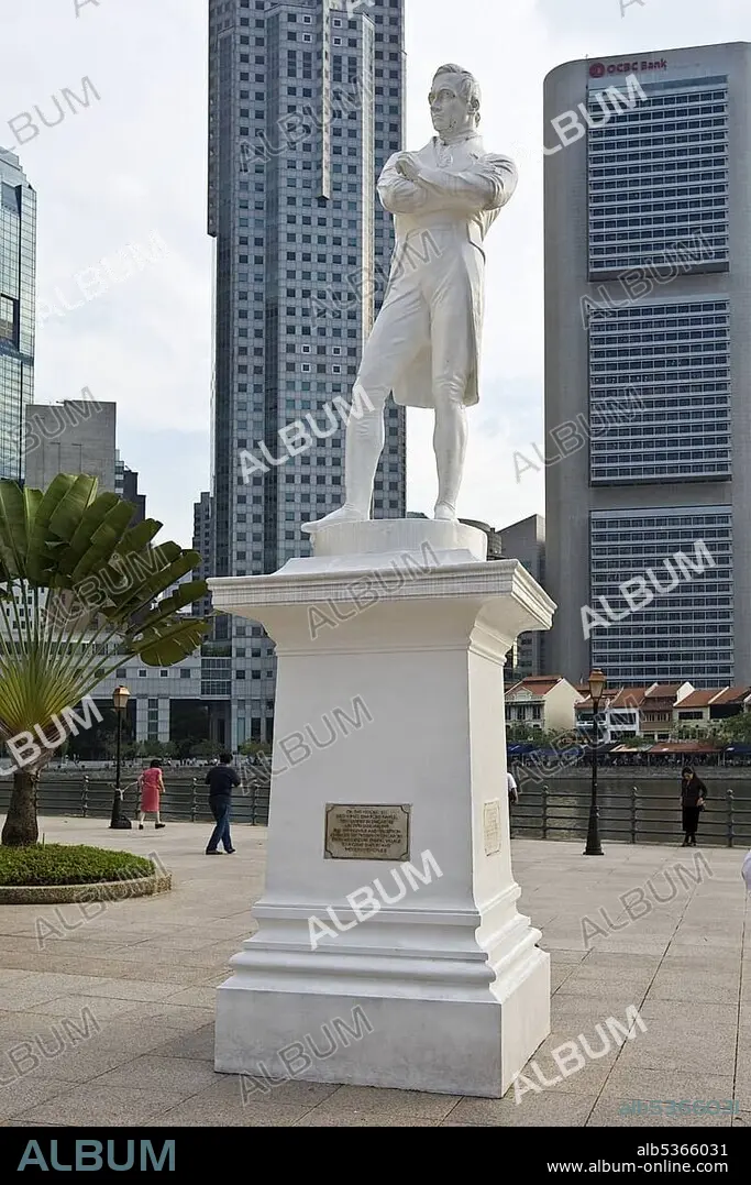 Statue of Sir Thomas Stamford Raffles, the founder of Singapore, in front of the Singapore River and Financial District, Singapore, Southeast Asia