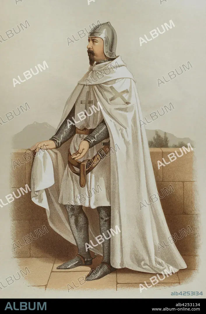 Caballero de la Orden de San Julián del Pereiro en traje de guerra. Fundada en Portugal en 1093 con el nombre de Orden de San Julián del Pereiro. Tras el traslado de su sede a la villa de Alcántara, los maestres se empezaron a titular Maestres de la Orden de Alcántara, dejando de utilizar su primera denominación. Cromolitografía. Historia de las Ordenes de Caballería y de las Condecoraciones Españolas. Madrid, 1865. España.