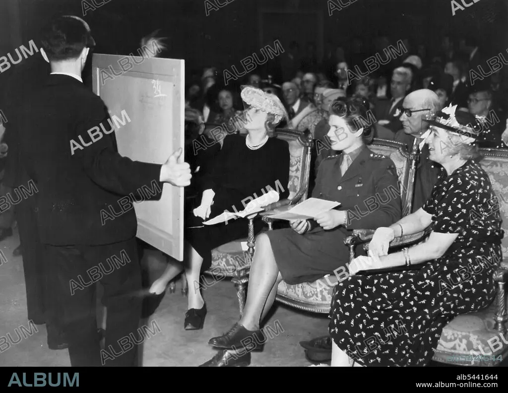 Premiers Daughter Opens Paris Sale -- Miss Churchill with Lady Diana Cooper at the sale. Over £6,000 was raised in Paris for London's child air raid victims at an auction sale of oil paintings and pictures presented by Paris an artists and collectors. Junior Commander Mary Churchill opened the sale. July 23, 1945. (Photo by L.N.A.).