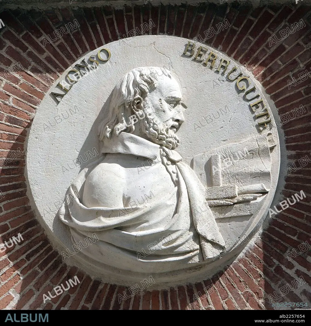 ALONSO DE BERRUGUETE. ESCULTOR ESPAÑOL. PAREDES DE NAVA 1490 - 1561. MEDALLON ESCULTORICO EN LA FACHADA DEL MUSEO DEL PRADO EN MADRID OBRA DE RAMON BARBA Y VALERIANO SALVATIERRA EN EL AÑO 1830.