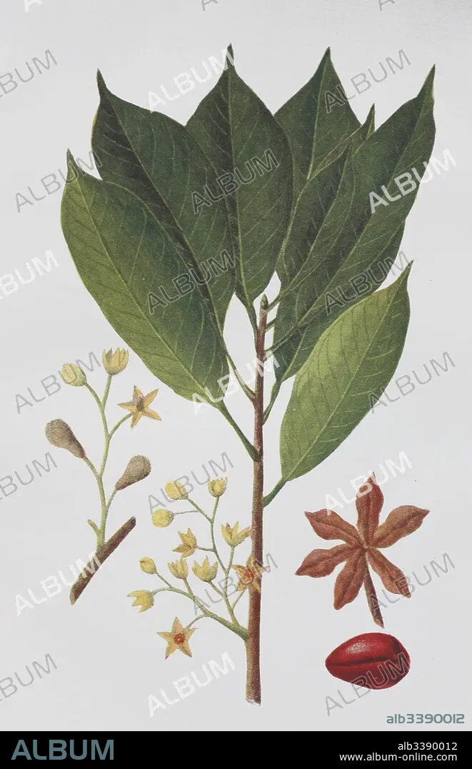 Cola acuminata, Cola nuts tree, Kola nut, historical illustration, 1880