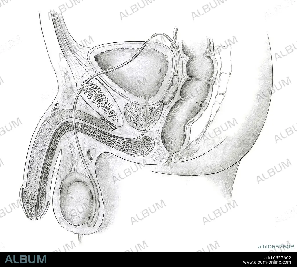 Diagram of the male reproductive system, showing the bladder, pubic bone, urethra, shaft, glans, foreskin, urethral opening, scrotum, testes, epididymis, vas deferens, anus, prostate, rectum, and seminal vesicles.