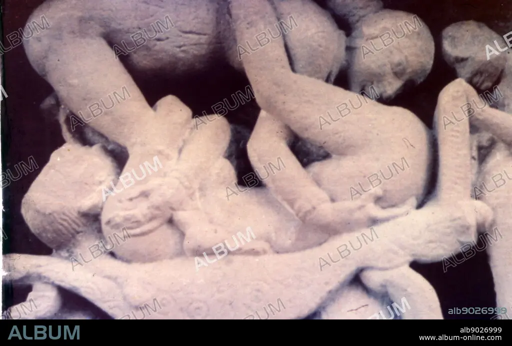 Sculpture from the Khajuraho Group of Monuments is a group of Hindu and Jain temples in Madhya Pradesh, India. They are one of the UNESCO World Heritage Sites in India. The temples are famous for their nagara-style architectural symbolism and their erotic sculptures. Most Khajuraho temples were built between 950 and 1050 by the Chandela dynasty. The Khajuraho group of temples were built together but were dedicated to two religions, Hinduism and Jainism