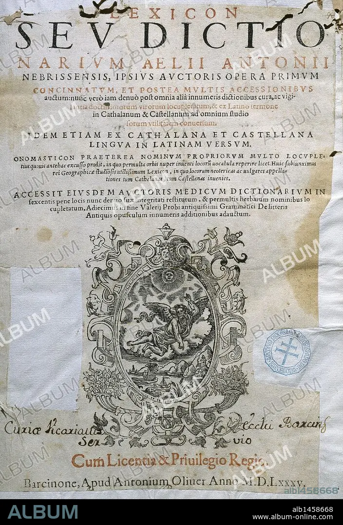 LITERATURA CASTELLANA. SIGLO XVI. ELIO ANTONIO DE NEBRIJA (1441-1522). Humanista y gramático español. "LEXICON SEV DICTIONARIUM AELI ANTONII NEBRISSENSIS IPSUS AUTORIA OPERA PRIMUM". Portada del diccionario latín-catalán-castellano, corregido y enmendado por Antic Roca. Impreso y editado en Barcelona en el año 1585.