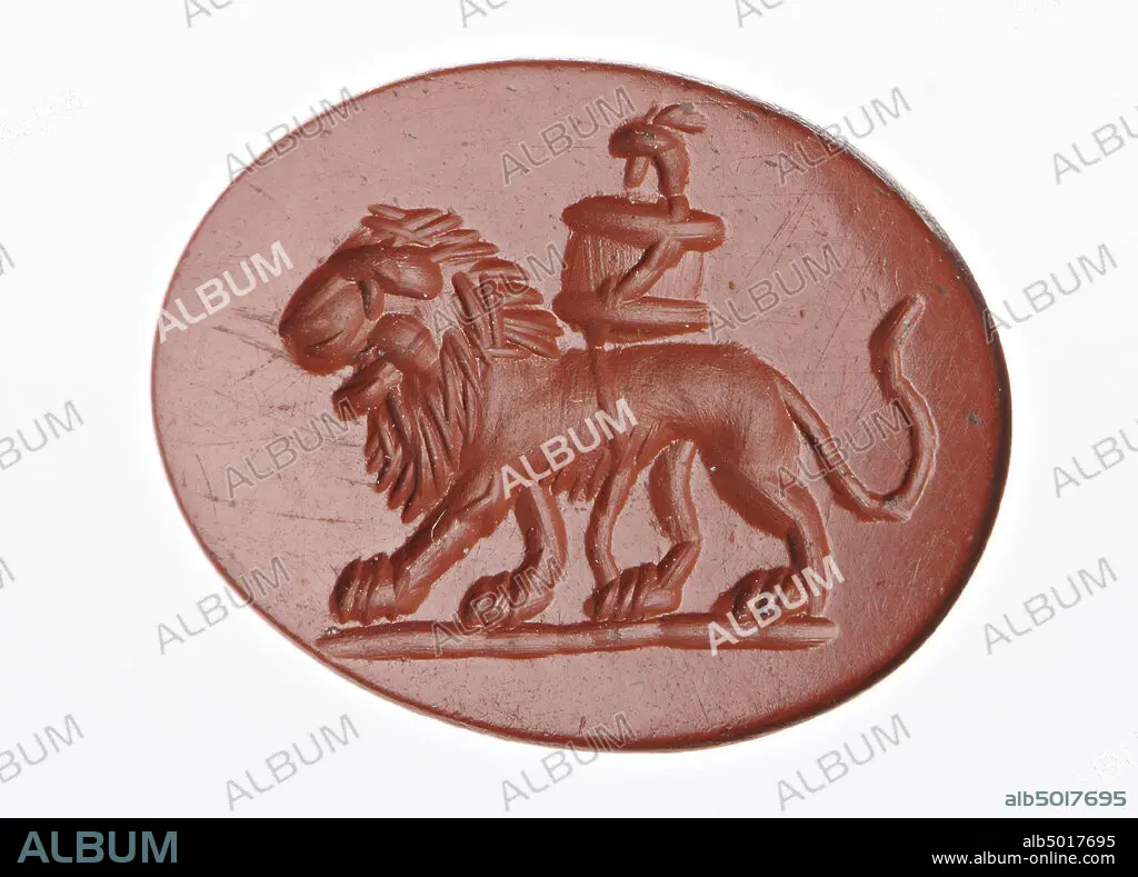 Vz: a lion walks with a basket tied to his back, probably the cista mystica., Gem, intaglio, ringstone, jasper, Color: red, Shape: oval, Processing: edge at the back receding cut compared to front, Method: coarse body modeling with a large rounded drill, detailing with short wheel grooves., 14 x 11 mm, D. 4 mm, 2nd - 3rd century AD. 100-300 AD.