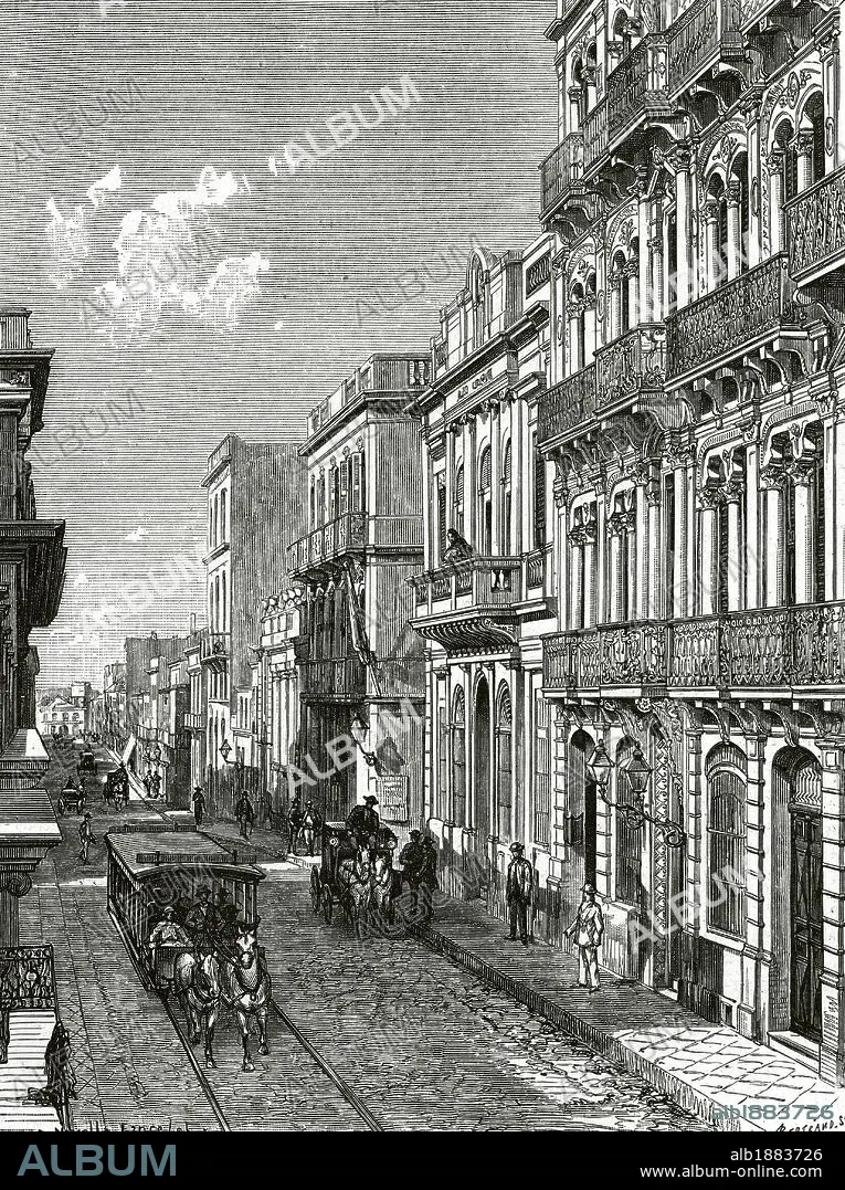 URUGUAY. SIGLO XIX. MONTEVIDEO. Una calle de la ciudad. Grabado por A. Bertrand publicado en "La Ilustración" (año 1887) .